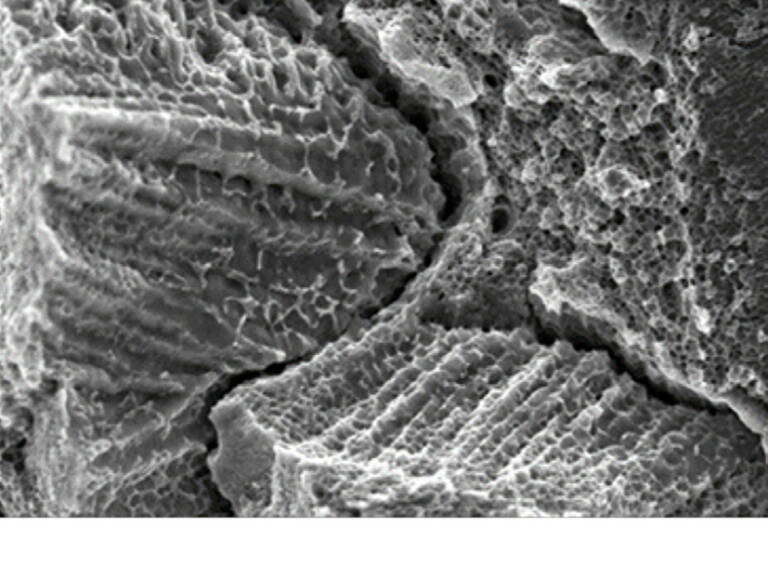 Les observations MEB-FEG (figure 1c) confirment la fissuration interdendritique. La vitesse de solidification étant très rapide en PBF-LB (environ 105 °C/s) les dendrites de solution solide sont très fines[8]. À fort grossissement, on note que les fissures laissent apparaître des ensembles de fines dendrites bien dessinées.
