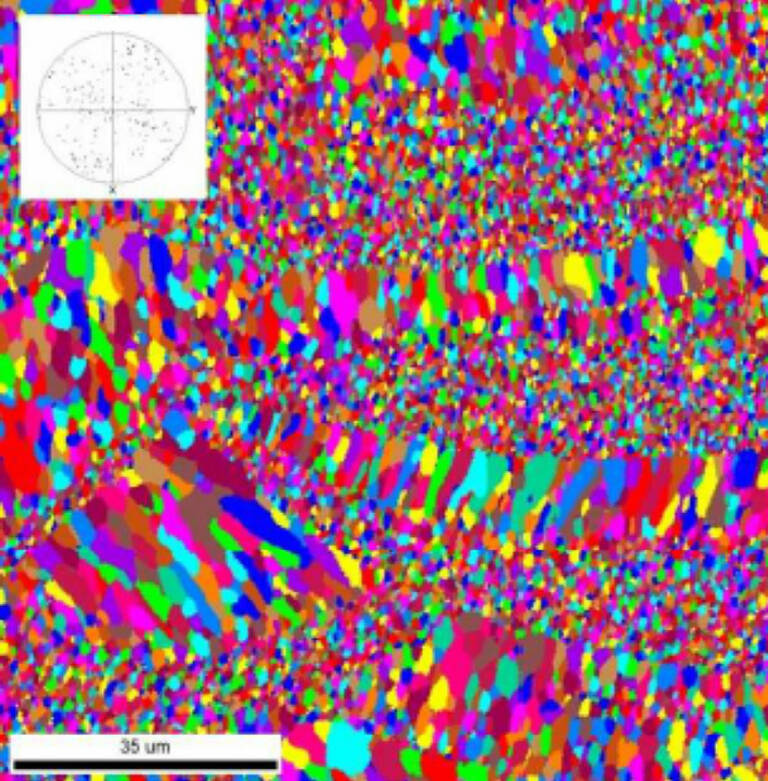 Figure 3. Carte EBSD présentant des zones à grains très fins dues à l’affinage au Zr.
