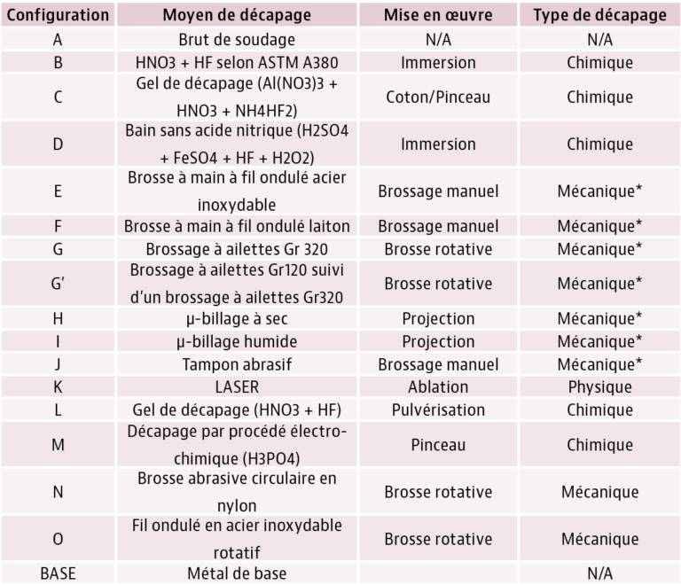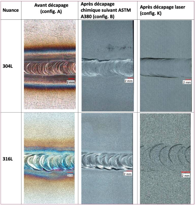 Ce décapage laser a été comparé en tant que méthode physique alternative aux décapages chimiques et mécaniques (voir Tableau 2) pour l’élimination des oxydes colorés formés après soudage TIG (tungsten inert gas) sur aciers inoxydables 304L et 316L.
