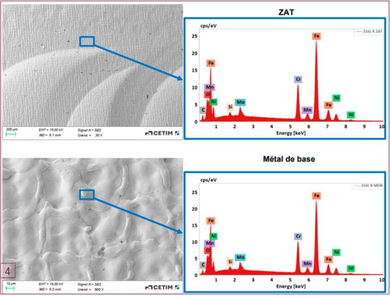 Figure 4. Images MEB et spectres EDS d’une soudure en acier inoxydable 316L au niveau de la ZAT et du métal de base après traitement de décapage par laser (config. K).