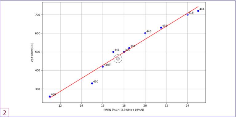 Par ailleurs, d’après la littérature, le potentiel de piqûre des aciers inoxydables est directement lié à leur PREN (Pitting Resistance Equivalent Number, ou nombre équivalent de résistance aux piqûres) (Figure 2), et la microstructure a également un impact puisque les aciers ferritiques comme le 430 (1.4016) ont des valeurs de potentiel de piqûre nettement inférieures aux grades austénitiques comme le 304L et le 316L. Il est donc important de s’assurer que la tenue à la corrosion de diverses nuances est maintenue lorsqu’une nouvelle méthode de décapage est étudiée.