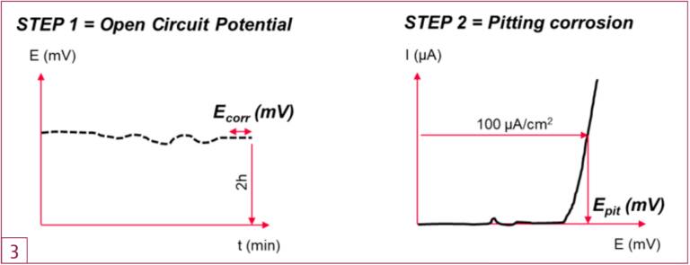 Ecorr : Après 2 h d’immersion en circuit ouvert, cette valeur est obtenue en moyennant les valeurs des 30 derniers points (dernière minute de mesure) en absence de fluctuation.
