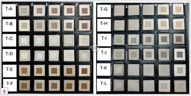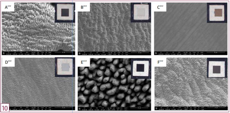 Lorsqu’un laser à durée d’impulsion ultra-courte entre en contact avec la surface, une réorganisation de la matière a lieu. D’un point de vue macroscopique, cela altère la diffraction de la lumière et donc la coloration de la surface. Ainsi, une surface métallique peut devenir irisée, brune, mat ou même noire selon les paramètres utilisés (voir Tableau 3), comme montré sur la Figure 8.