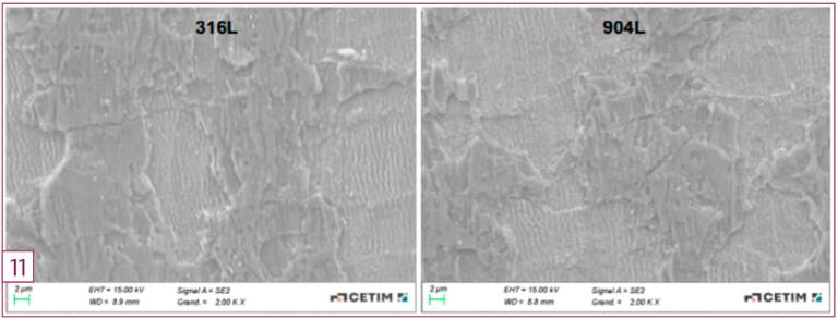 Pour l’acier inoxydable 904L, aucune courbe n’a atteint une densité de courant de 100 µm / cm2 (pas de piqûre) lors des essais à 25 °C. À 40 °C, seulement un échantillon représentatif de la surface brute a permis d’obtenir une valeur de Epit alors que les échantillons texturés n’ont jamais atteint la valeur seuil indiquant une piqûre.