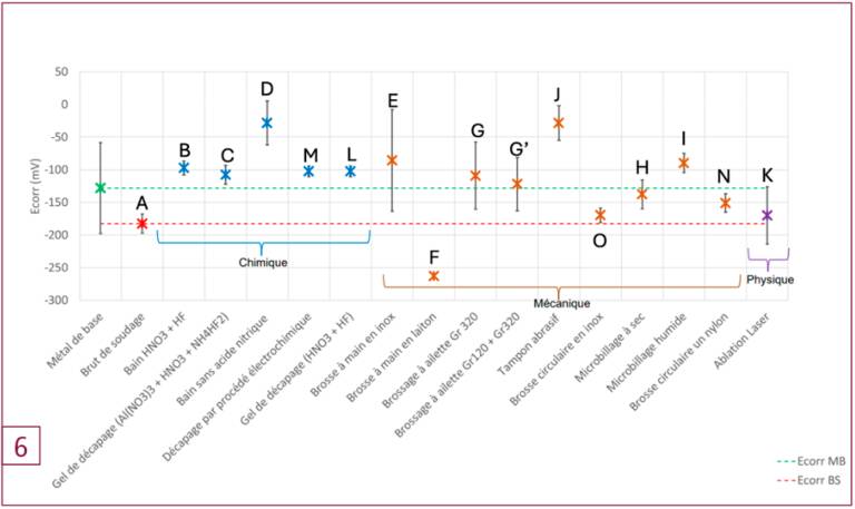 Les valeurs de Ecorr pour les cordons de soudure de deux nuances décapés par laser sont légèrement inférieures à celle du métal de base et de ceux décapés chimiquement (voir Figure 7 pour l’acier 316L). Ceci pourrait indiquer un caractère moins « noble » de la surface, mais les écarts ne sont pas significatifs.