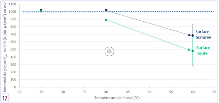L’essai à 60 °C reste le plus probant car la corrosion de la surface brute commençait en moyenne à des valeurs plus faibles de potentiel en comparaison avec les surfaces texturées. À noter également que les valeurs de Epit pour la surface brute sont plus dispersées que pour les surfaces texturées.