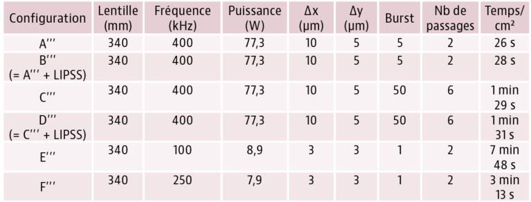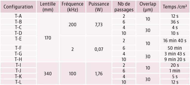 Tableau 3. Jeux de paramètres de laser femtoseconde pour la texturation de l’acier 304L.