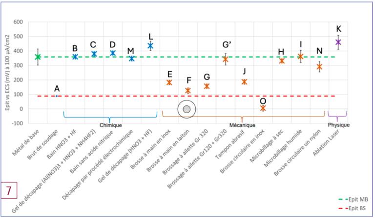 Concernant le décapage laser (config. K), les valeurs de Epit sont supérieures ou équivalentes au métal de base et au décapage chimique standard (config. B) et bien au-dessus de la plupart des méthodes mécaniques. En effet, ce procédé permet (i) l’élimination complète des oxydes ferreux sensibles à la piqûration, (ii) n’apporte pas de pollution externe et (iii) entraine une rugosité faible (favorable à la passivation naturelle).