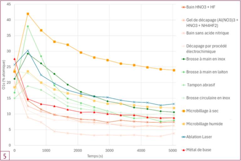 La Figure 5 montre l’évolution de la quantité en oxygène O1s en fonction du temps d’érosion. Pour les décapages chimiques, la concentration en oxygène de la couche de passivation diminue rapidement entre l’analyse en surface (temps d’érosion = 0 s) et les premières analyses en profondeur. Ce comportement est similaire à celui observé pour le métal de base. En revanche, pour les décapages mécaniques et le décapage laser, il a été constaté que la teneur en oxygène entre la surface et le premier point d’analyse en profondeur augmente pour ensuite diminuer progressivement lorsque le temps d’érosion augmente.