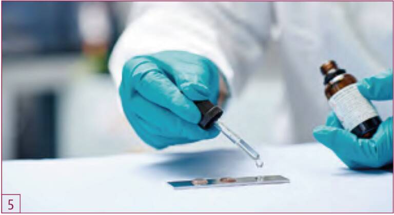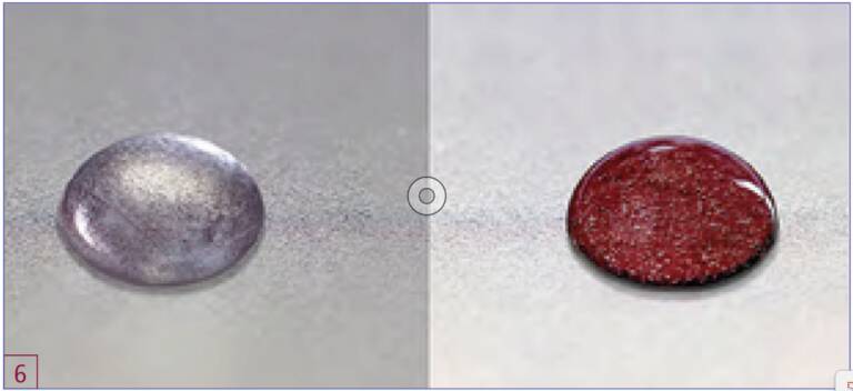 Pour une évaluation rapide des paramètres PlasmaPlus sélectionnés, différents fluides de test ont été développés afin de fournir des informations immédiates sur leur efficacité. La nouvelle méthode développée en interne est basée sur la norme EN ISO 2085:2018. Une goutte d'acide fort contenant des ions cuivre dissous est appliquée sur la surface. Cette analyse électrochimique des défauts permet de visualiser les résultats en quelques secondes, fournissant ainsi une indication rapide et fiable de l'efficacité du revêtement contre la corrosion (figures 5 et 6).