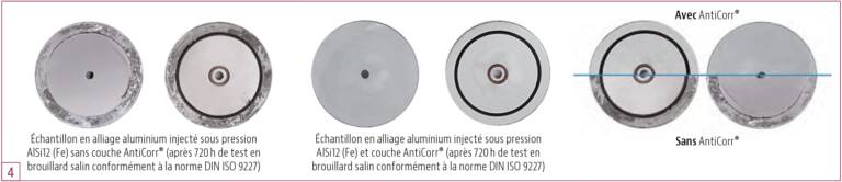 Figure 4. Échantillons d'essai en aluminium moulé sous pression avec l'alliage AlSi12 (Fe) avec et sans revêtement AntiCorr® (après 720 heures d'essai au brouillard salin selon DIN ISO 9227).