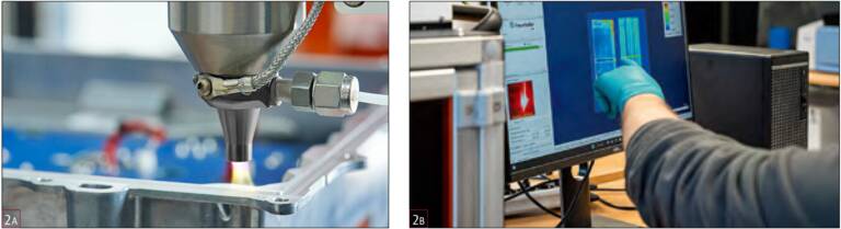 Figure 2 : A. Avant l’application du revêtement, la surface d’étanchéité est nettoyée avec précision par plasma à l’air libre, éliminant efficacement la poussière et les saletés issues des procédés précédents. B.Grâce à différents outils d’analyse, ici le F-Scanner de l’institut Fraunhofer IPM, les contaminants présents sur les surfaces métalliques sont visualisés, permettant ainsi de vérifier l’efficacité du nettoyage au plasma. © Plasmatreat GmbH