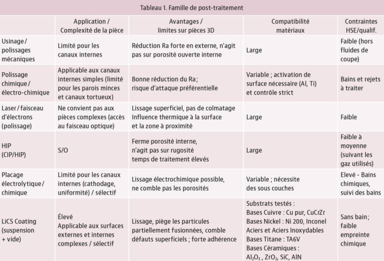 Le tableau 1 synthétise les caractéristiques de quelques familles de post‑traitements vis‑à‑vis des besoins « aéronautique/défense/spatial ». Les procédés d’ablation (polissages, usinage, laser) sont efficaces sur les surfaces accessibles mais montrent leurs limites dans des architectures enclavées.