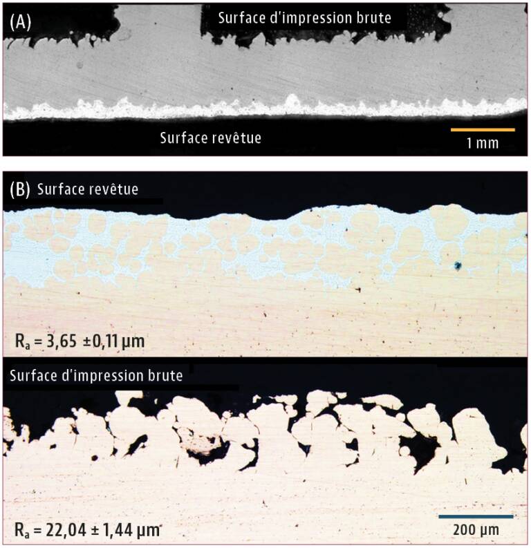 Figure 3. Exemples d'utilisation de la technologie LiCS Coating® : (A) substrat en TA6V obtenue pas EBM. Rugosité de la surface d'impression brute (au-dessus)