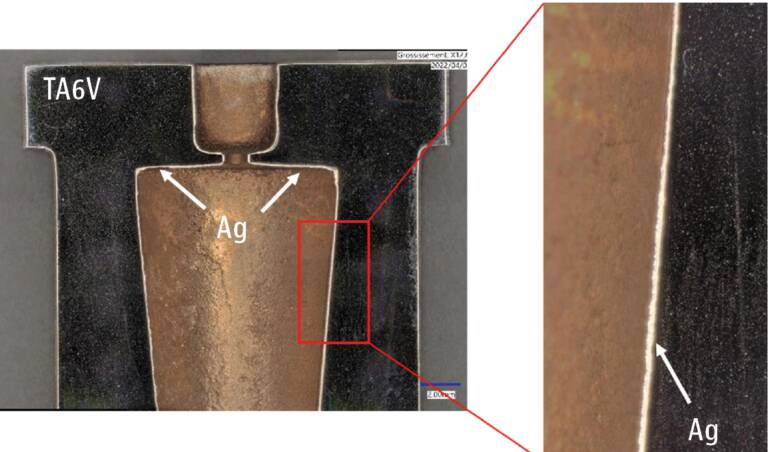 - une compatibilité avec des substrats de faible conductivité thermique (titane) où un placage peut être délicat. Sur des cavités ou guides en TA6V, un dépôt base Ag jusqu’à 100 µm fournit une peau conductrice homogène (figure 2).